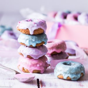 If making frosting, mix 1 cup icing sugar with 2-3 tbsp cashew mylk until thick and smooth. Add more mylk if you need to, a tbsp at a time. Now divide into three bowls and add a drop of vegan food colouring paste. Stir well and dunk each donut to coat.