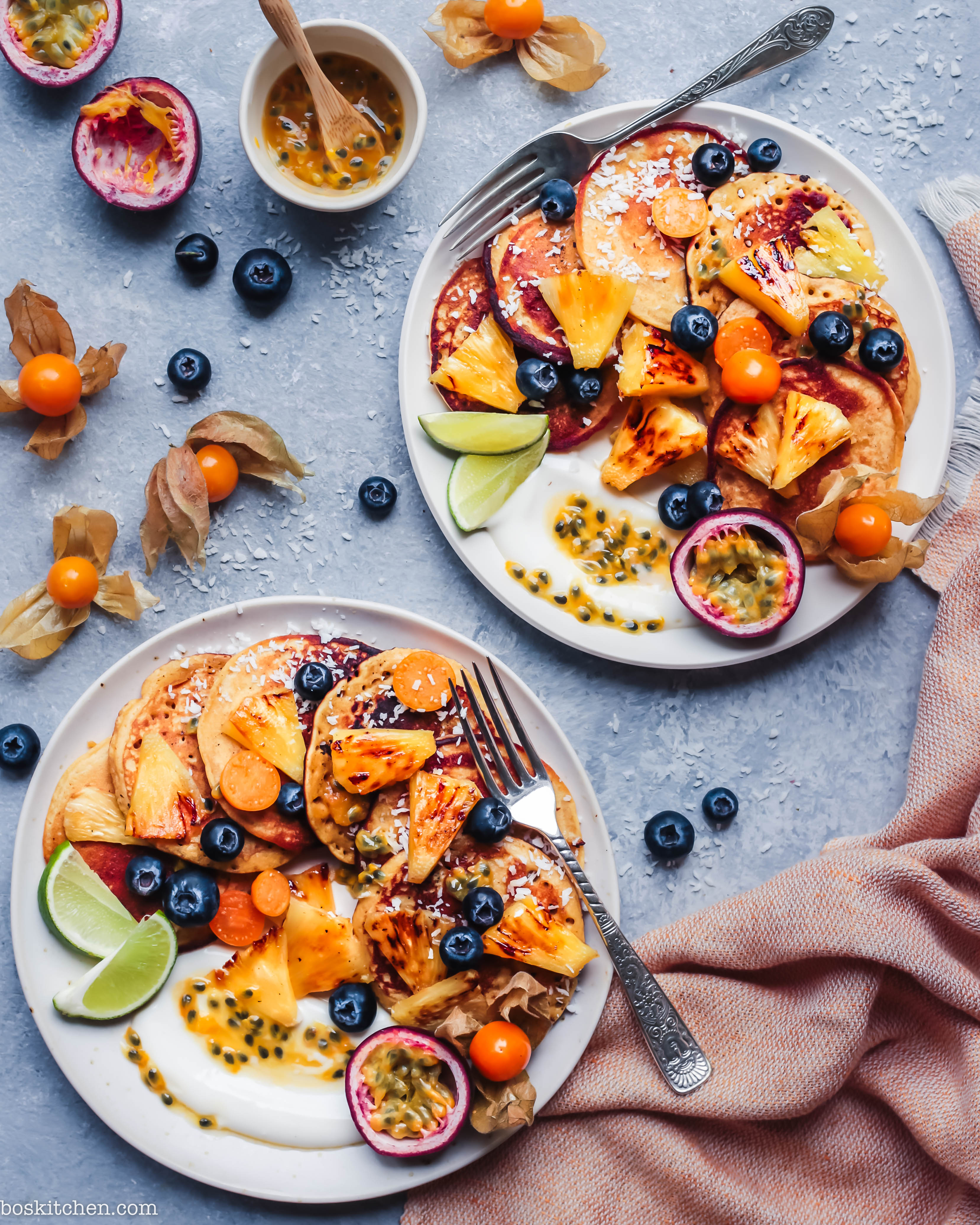 Serve with coconut yoghurt, tropical fruits, grilled pineapple and a big squeeze of lime.